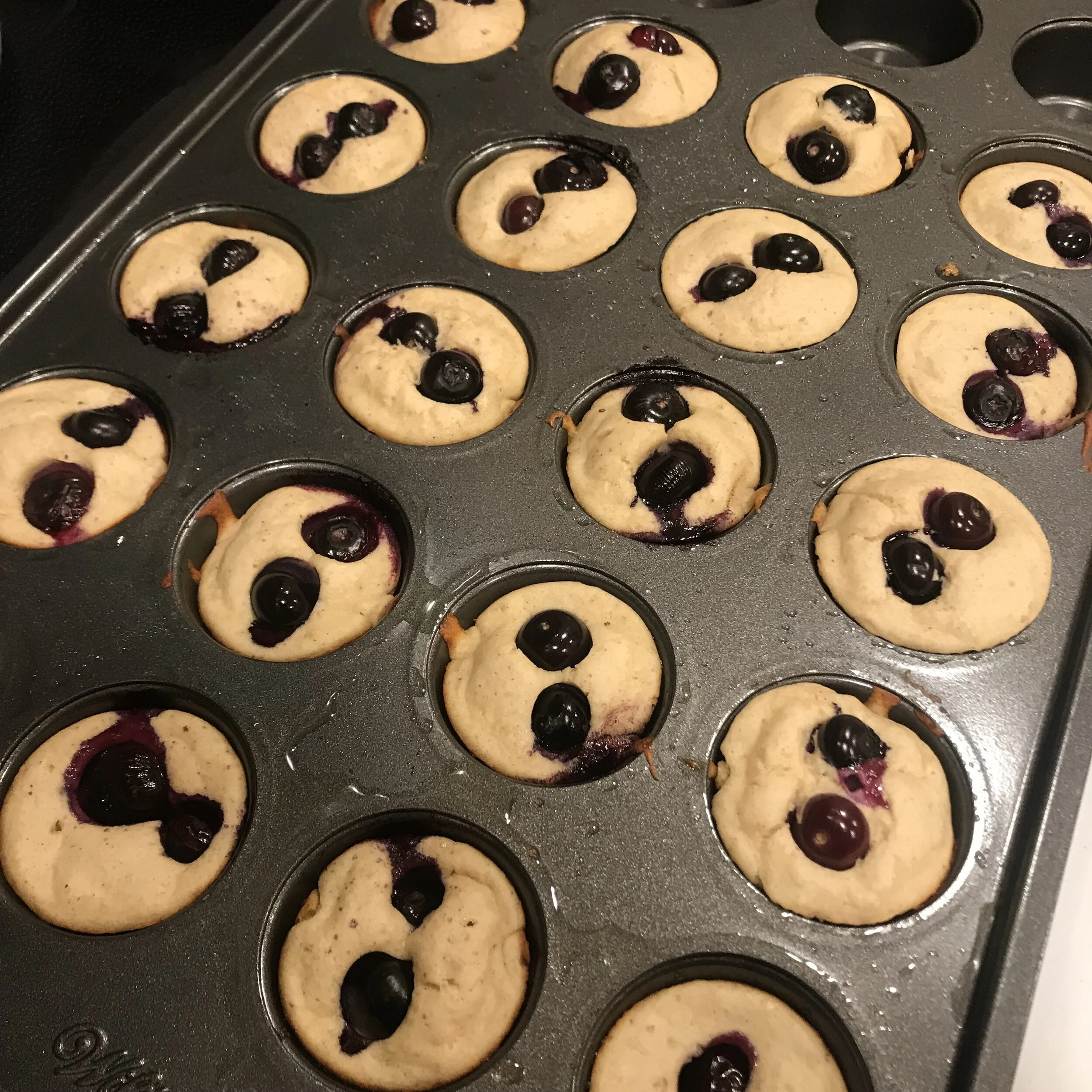 Preheat oven to 350 degrees. Mix all ingredients (besides blueberries) in a food processor or blender until combined. Pour into mini muffin tin leaving some room for the blueberries. Add two blueberries to the top of each muffin. Bake until it can pass the toothpick test (roughly 8-12 min).