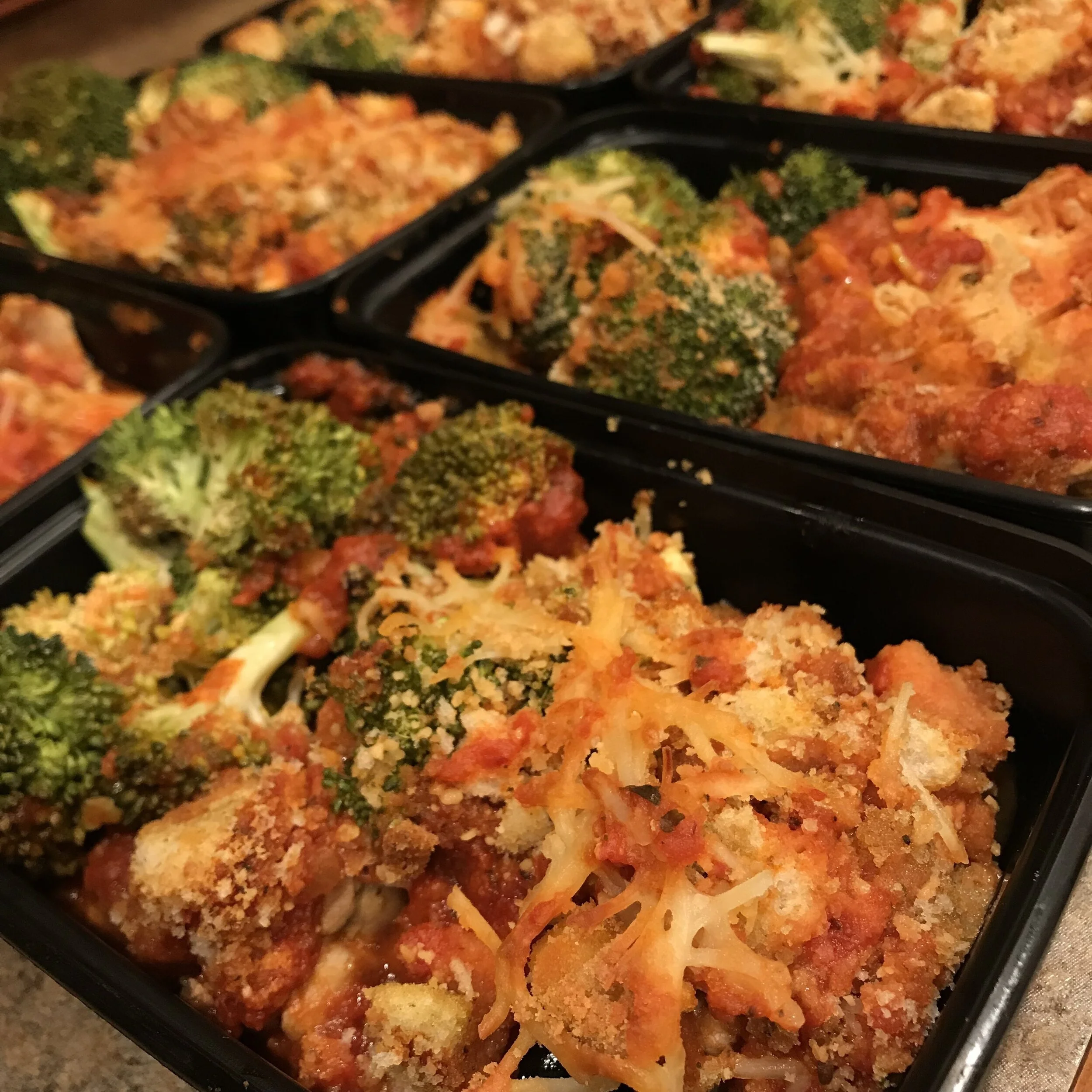 4) Crunch up croutons in bag but leave big chunks and mix with some parmesan cheese! Top chicken with half of this mix, the last half of the marinara, and the final half of the crouton mix! Sprinkle broccoli with a little oil and parm! Cook for 20 minutes or until parm starts to brown and crisp! ENJOY!