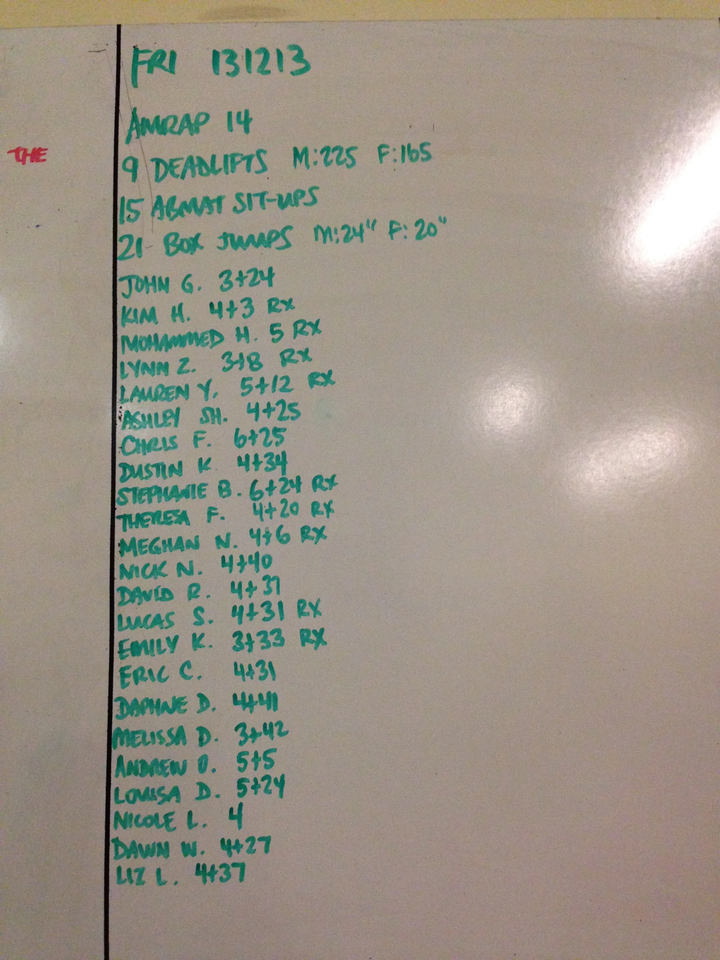 131213 WODAMRAP 14:9 deadlifts M:225 F:16515 abmat sit-ups21 box jumps M:24 F:20 Michael ReynoldsDecember 13, 2013Comment Facebook0 Twitter 0 Likes