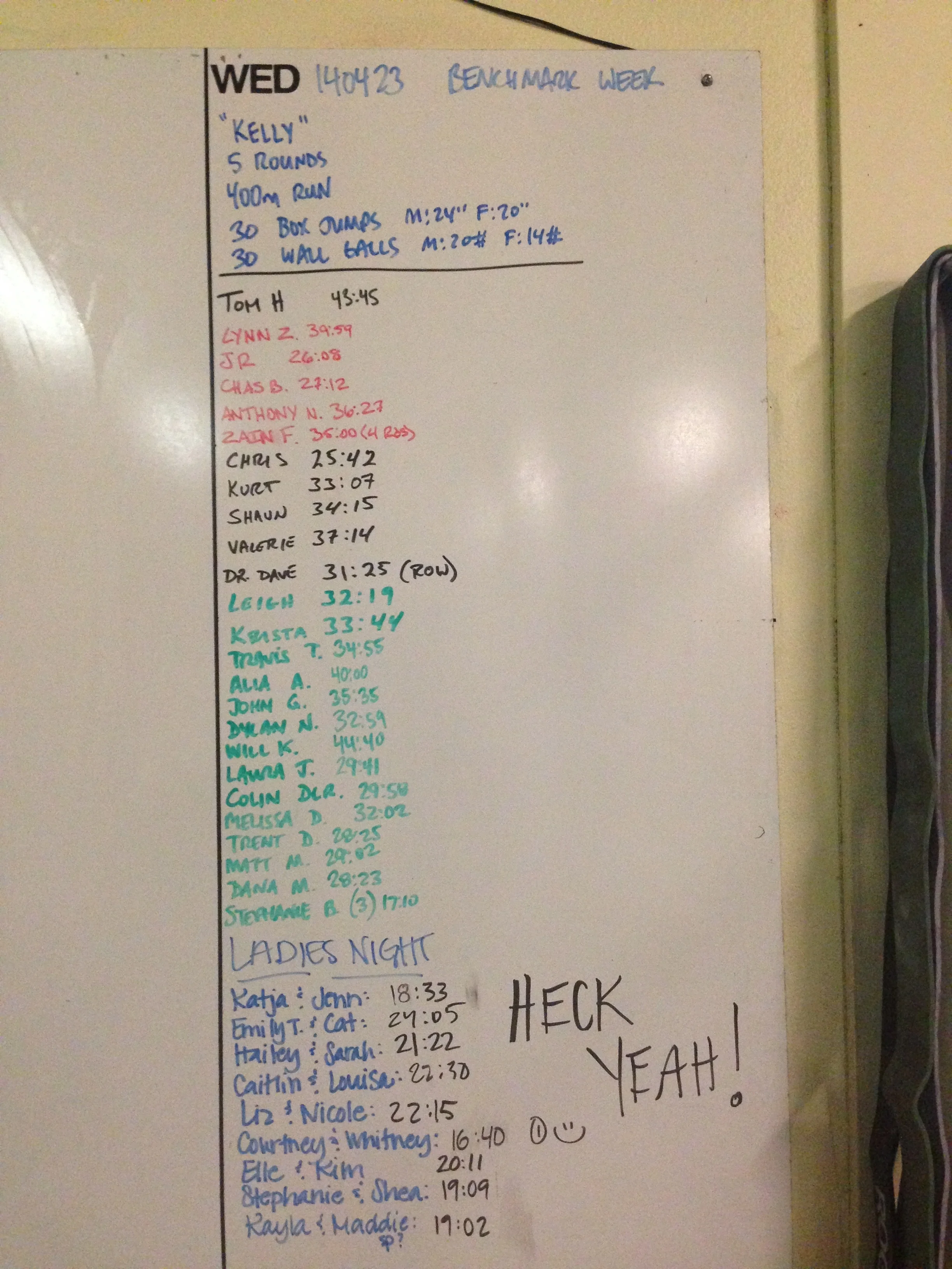 140423 Benchmark Benchmark WOD"Kelly"5 rounds400m Run30 Box jumps M:24" F:20"30 Wall balls M:20 F:14 Michael ReynoldsApril 22, 2014Comment Facebook0 Twitter 0 Likes