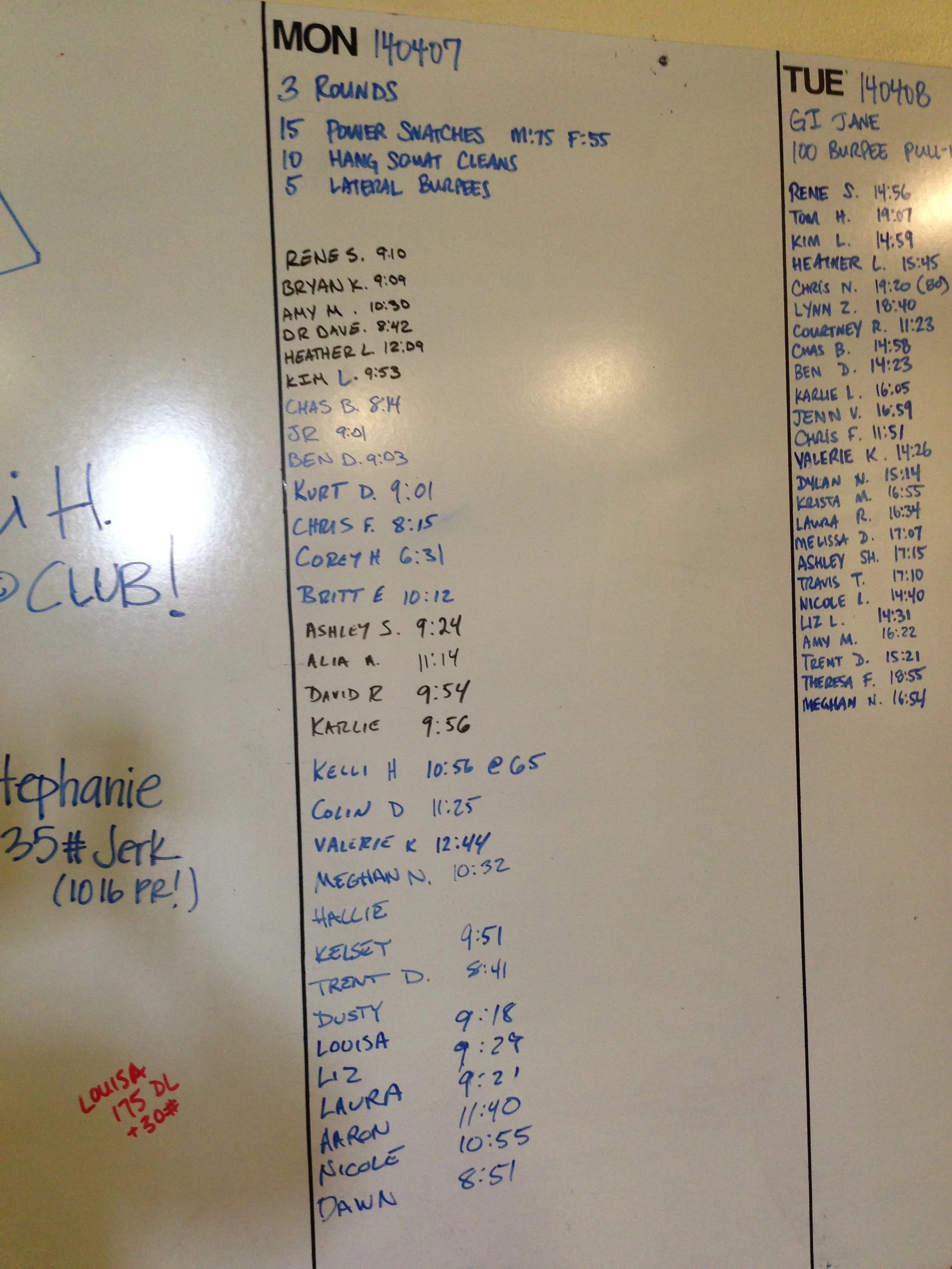 140407 3 rounds15 Power snatches M:75 F:5510 Hang squat cleans5 Lateral burpees Michael ReynoldsApril 9, 2014Comment Facebook0 Twitter 0 Likes