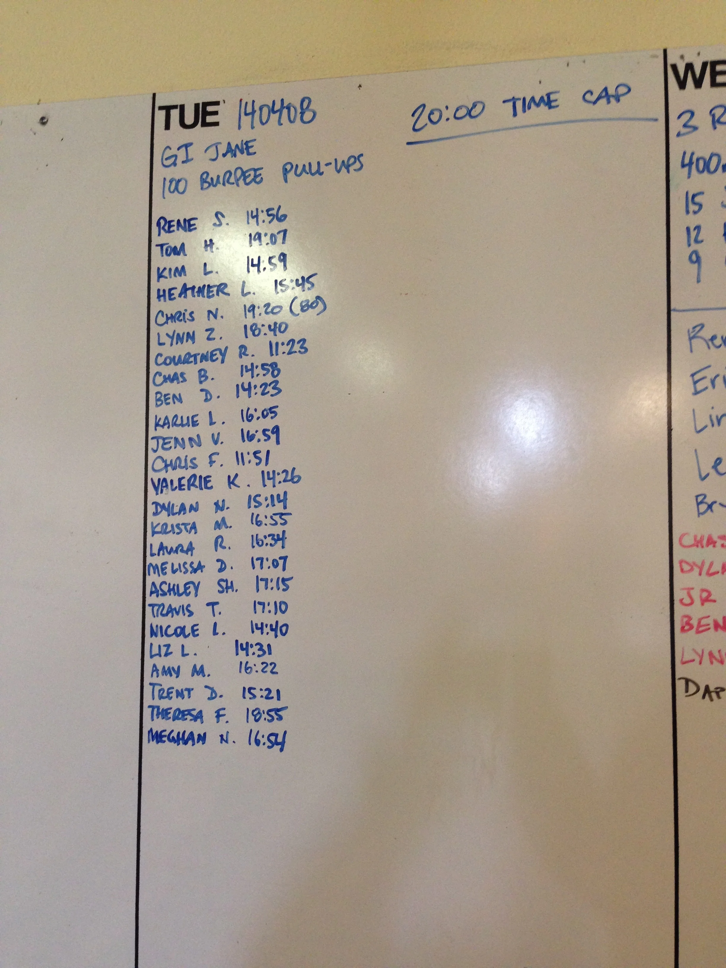 140408 "GI Jane" 20: time cap100 burpee pull-ups Michael ReynoldsApril 9, 2014Comment Facebook0 Twitter 0 Likes