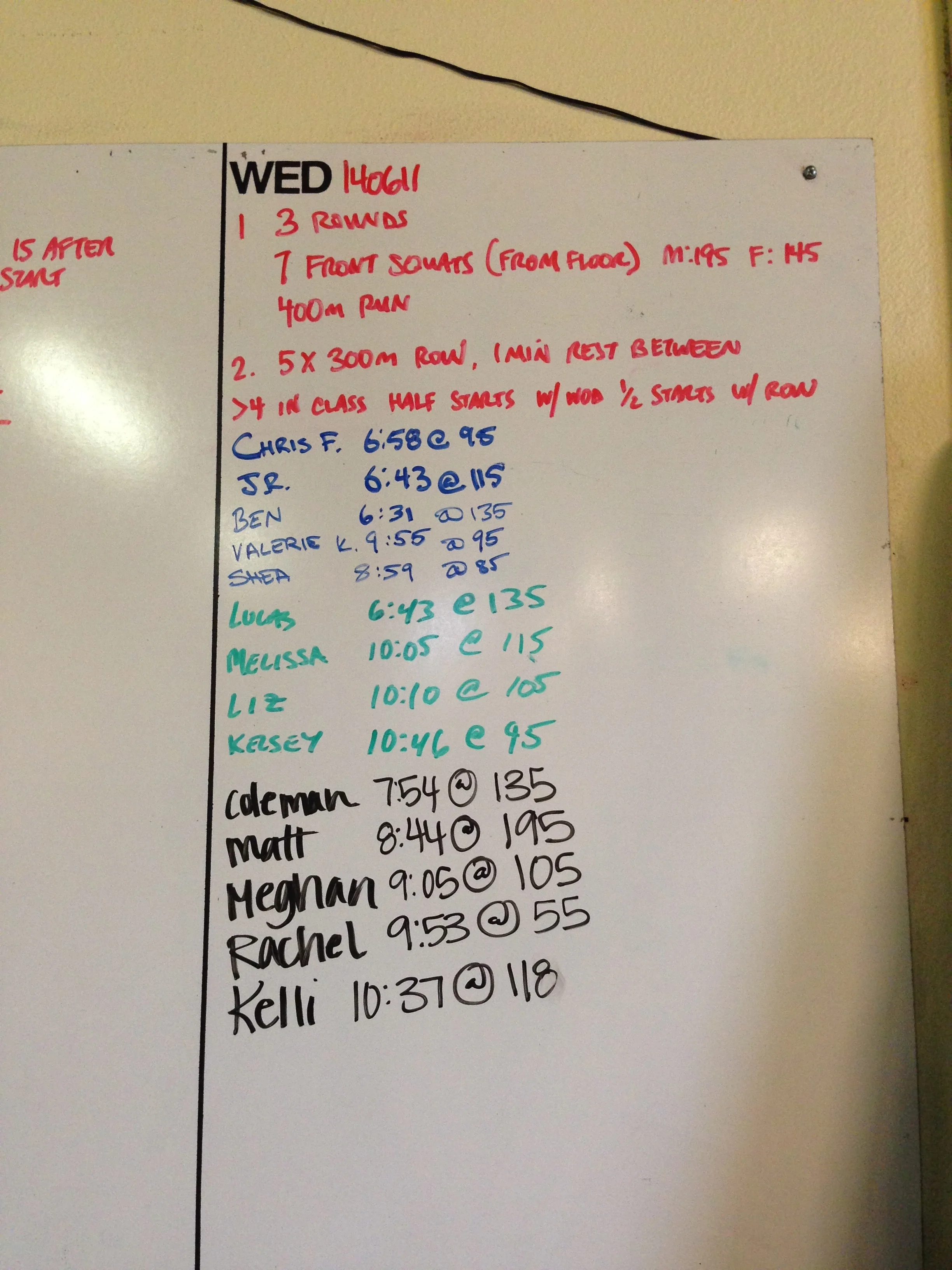 140611 WOD 13 rounds7 front squats (floor) M:195 F:145400m runWOD 2 5x 300m row 1 min rest between attempts Michael ReynoldsJune 11, 2014Comment Facebook0 Twitter 0 Likes