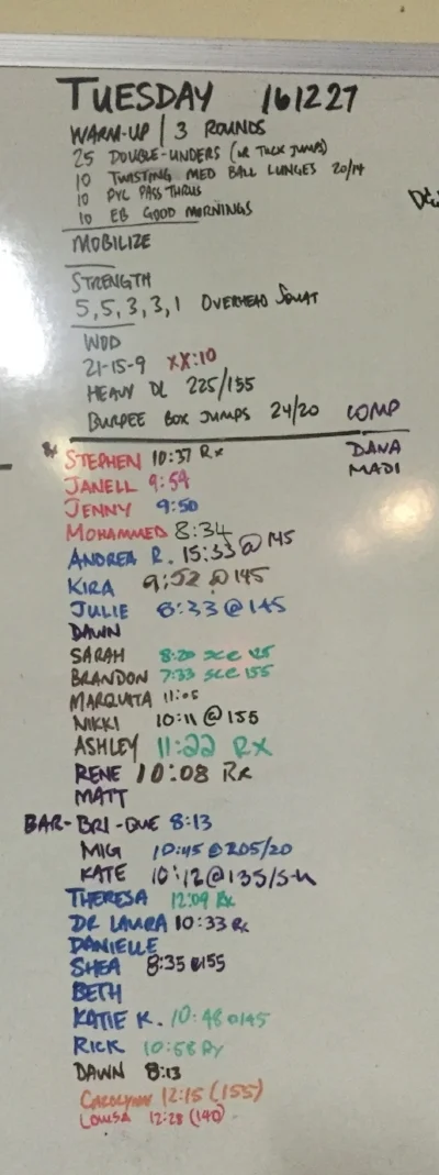 161227 - CrossFit Strength5, 5, 3, 3, 1 Overhead squatWOD21-15-9Heavy DL 225/155Burpee box jumps 24/20 Michael ReynoldsDecember 27, 2016overhead squat, heavy DLComment Facebook0 Twitter 0 Likes