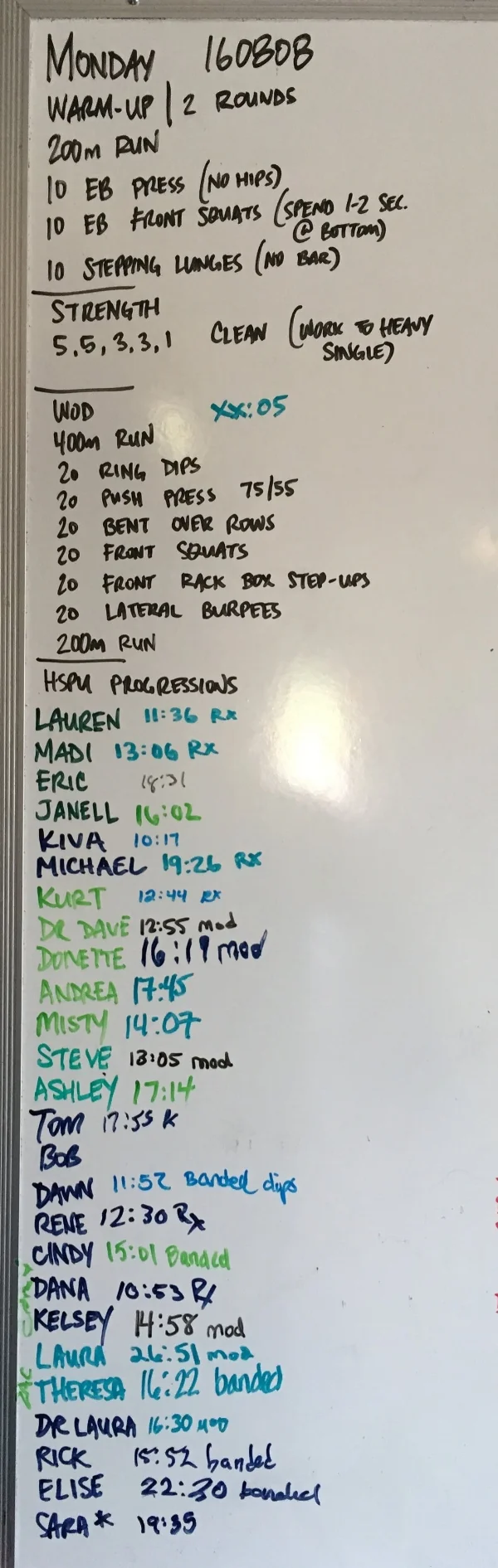 160808 - CrossFit STRENGTH5, 5, 3, 3, 1 CleanWOD400m run20 ring dips20 push press 75/5520 bent over rows20 front squats20 front rack box step-ups 20 lateral burpees200m run Michael ReynoldsAugust 8, 2016clean, run, ring dips, push ress, bent over row, front squat, box step-up, lateral burpeesComment Facebook0 Twitter 0 Likes